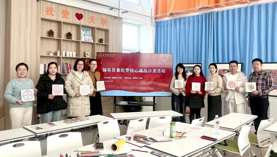 12 月 16 日,我校 “红苗启航” 、“南来北往” 两个辅导员工作室在 “一站式”学生社区顺利举办曼陀罗绘心沙龙活动。本次活动聚焦两个工作室内辅导员的心理调适与内在成长,以曼陀罗绘画为载体,邀请朱晓坤书记围绕曼陀罗绘画的减压原理,结合辅导员日常学生工作的压力特点,为在场辅导员开展专题讲解。讲解结束后,两个工作室的辅导员们沉浸式开展曼陀罗绘画创作,并围绕工作中的压力疏解、经验方法等内容交流分享。活动过程中,大家在轻松氛围中舒缓了工作压力,增进了彼此交流,同步强化了心理建设意识。